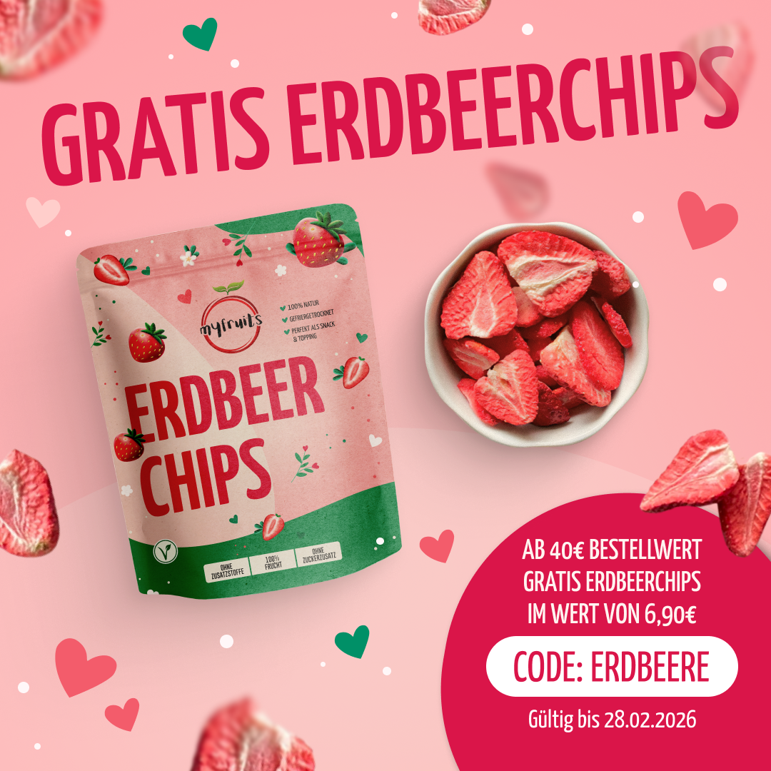 Ab einem Bestellwert von 40€ erhältst du eine Packung Erdbeerchips 50g im Wert von 6,90€ gratis zu deiner Bestellung dazu – perfekt zum Teilen, Verschenken oder für dich selbst. 💖