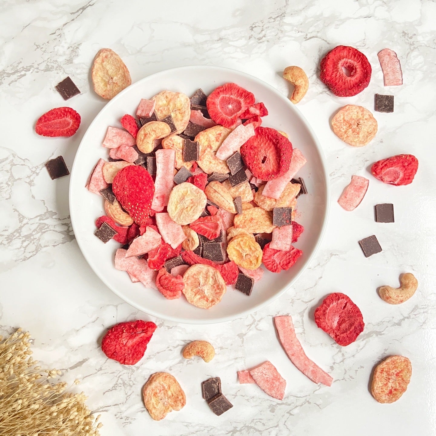 Leckere Frucht-Nuss-Mix mit Erdbeere, Banane & Dattelschokolade (Zartbitter)